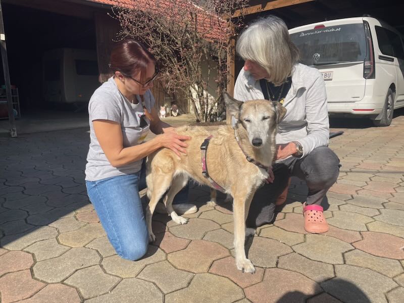 Unser Sorgenhund Dorie ist über die Regenbogenbrücke gegangen. Wie ihr wisst waren die letzten Wochen ein stetiges Ab bei dem wir uns immer wieder fragten wieviel Qualität Dorie noch in ihrem Dasein findet. Die letzten Tage und Nächte haben uns zur Entscheidung geführt, sie gehen zu lassen. Dorie fand keine Ruhe mehr, wanderte stundenlang jammernd und rastlos umher, auch nachts. Selbst Medikamente brachten keine Besserung, die Demenz ergriff vollends Besitz von Dorie. Jegliches Feuer, jegliche Freude war aus ihren Augen verschwunden, sie fand sich nicht mehr zurecht. Beim Getragenwerden hing sie schlapp in Connys Armen. Das Essen schaffte sie alleine nicht mehr und nur mehr verteilt auf viele kleine Portionen in Etappen. Ihr Körper war am Ende, kraftlos. Wir waren mit Dorie und der gesamten Tier-reich Familie nochmals am Hundeplatz. Ob sie noch wusste, dass sie dort war – ich weiß es nicht. Dann nochmals in meinem Garten, den sie immer so sehr geliebt hat. Ein Abschiedsbesuch ihres einstigen Weggefährten Gismo mit Susi und dann ein Nickerchen bis die Tierärztin kam. Essen während der Einschlafspritze und danach ging Dorie so friedlich und ruhig über den Regenbogen als hätte sie nur mehr darauf gewartet diesen letzten Schritt gehen zu dürfen…. Wir sind traurig aber gleichzeitig wissen wir, dass diese Entscheidung jetzt richtig war. Dorie hat in den dreieinhalb Jahren in denen sie im Tier-reich lebte alles, wirklich alles noch erleben dürfen das ein Hund haben sollte: Abenteuer, Ausflüge, Freundschaft, Zuwendung, Abwechslung, Ruhe, mentale und körperlich Auslastung, eine Reise ans Meer, frech sein, schlimm sein und vor allem: geliebt zu werden, so wie sie war, in guten und auch in den sehr fordernden schlechten Zeiten am Ende des Lebens. Ich danke Conny für alles was sie für Dorie getan hat. Dorie – ich danke Dir, dass Du so lange ein Teil der Tier-reich Familie warst. Wir hätten das nicht geglaubt, als wir Dich damals gerettet haben. Du warst am Ende, hattest aufgegeben. Dann kamst DU zum Vorschein, eine großartige liebenswerte lebensfrohe Persönlichkeit. Wir waren sehr gerne für Dich da 😘und schenkten Dir ein erfülltes Hundeleben in dem Du mehr als 16 Jahre alt werden durftest. Dorie, Du findest sicher Tier-reich Toby im Regenbogenland. Macht es Euch fein dort drüben. Ihr seid für immer in unseren Herzen.💜 🌈💜